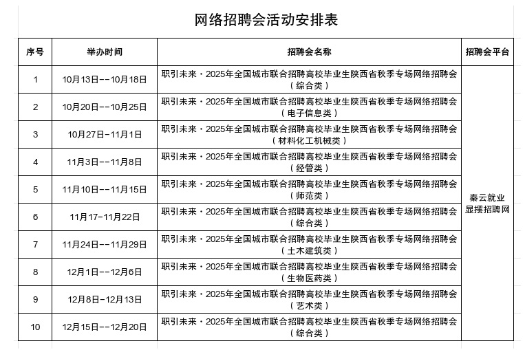 为进一步做好陕西省2026届高校毕业生就业工作,为求职者和用人单位搭建线上供需对接平台,全力以赴促进高校毕业等重点群体高质量充分就业。现将举办“乐业陕西‘就’在三秦2025年职引未来·全国城市联合招聘高校毕业生陕西省秋季专场网络招聘会10场,具体安排如下: