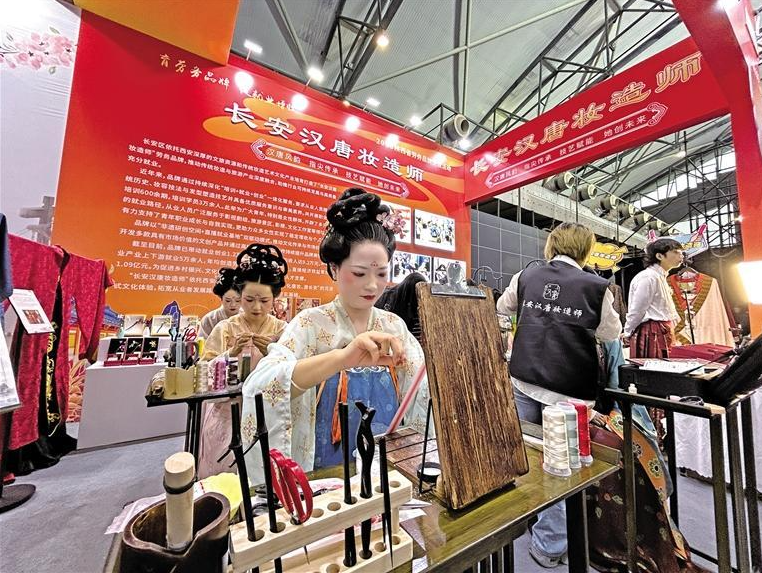 图为2025陕西省劳务品牌交流活动现场的“长安汉唐妆造师”劳务品牌展台(10月16日摄)。